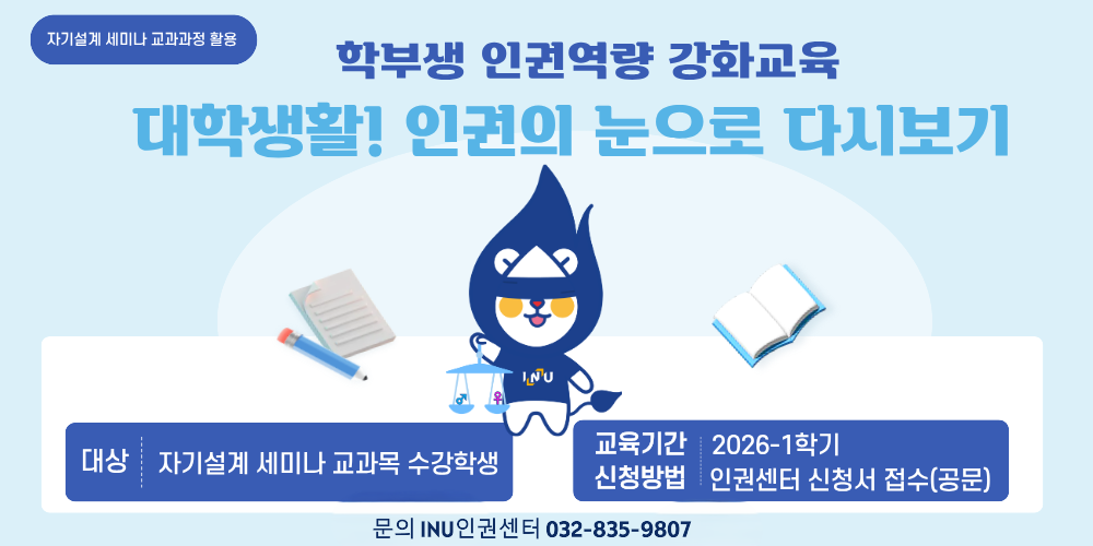 자기설계세미나 교과과정을 통해 학생들이 대학생활 전반에서 발생할 수 있는 인권침해 상황을 올바르게 인식하여 스스로 예방할 수 있는 감수성을 기를수 있도록 교육을 진행하오니 관심있는 학과 및 교수님께서는 많은 신청 부탁드립니다.