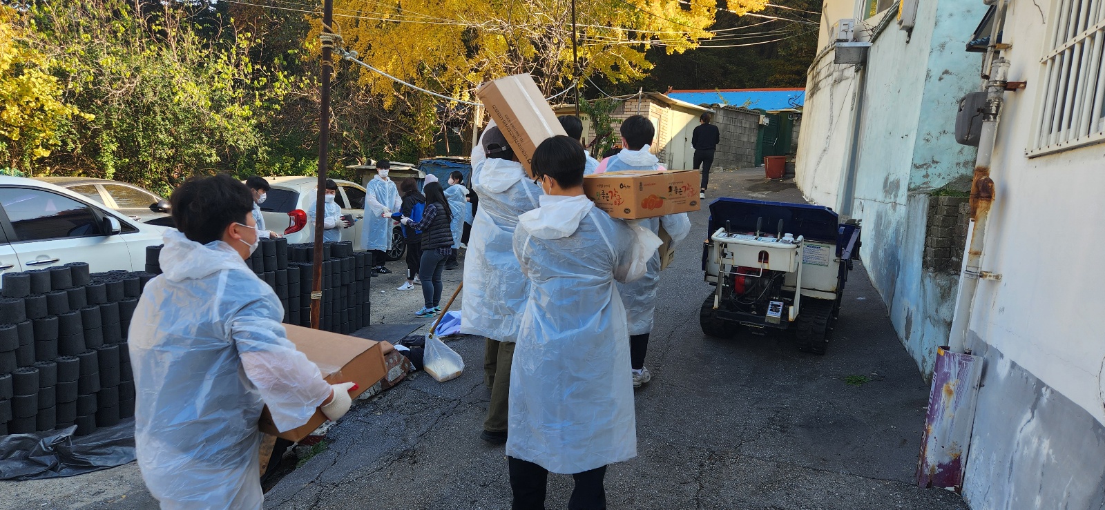 연탄과 쌀, 라면 등을 옮기고 있는 인천대 법학부 학생들