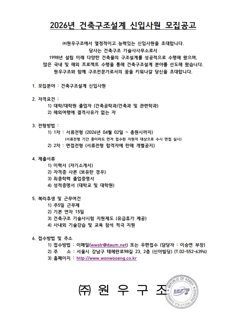 [(주)원우구조] 2026년 건축구조설계 신입사원 모집공고_충원 시까지