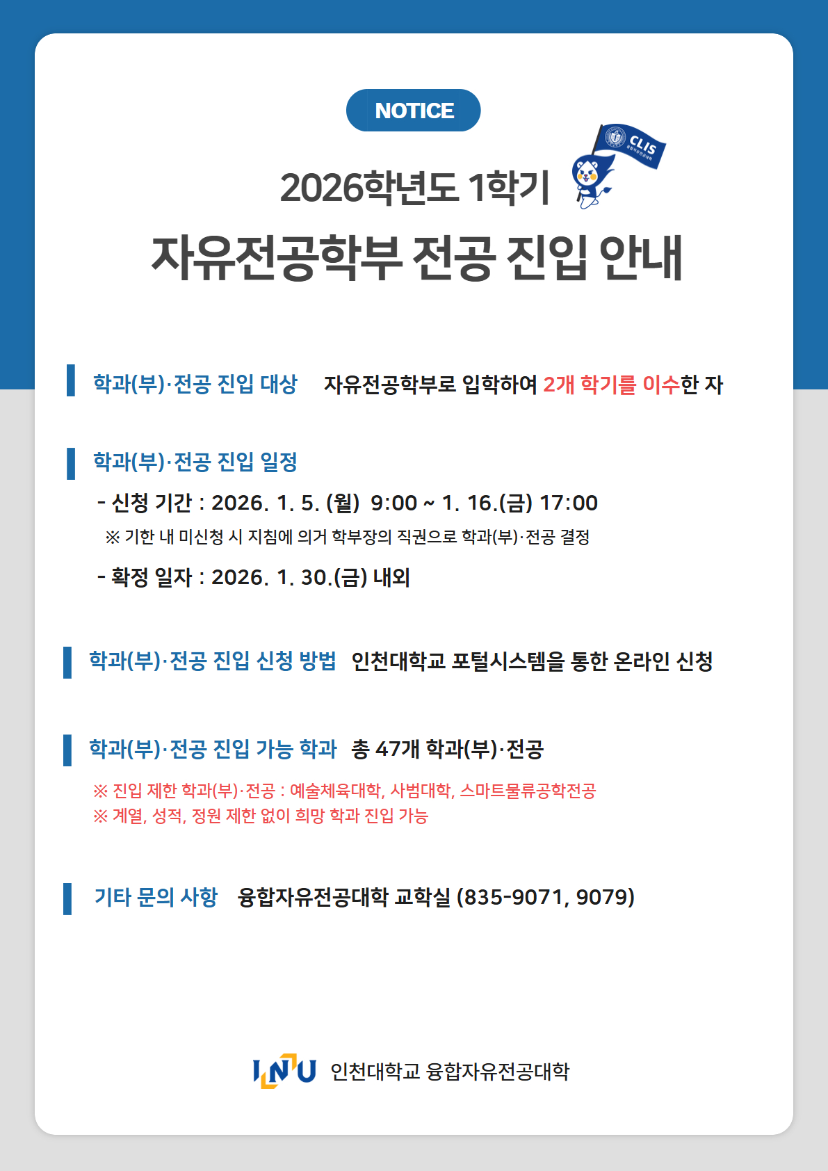 2026학년도 1학기 자유전공학부 전공 진입 일정 안내드립니다.