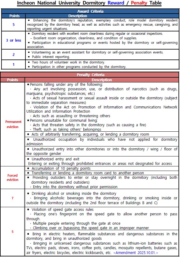 The dormitory residents’ reward and penalty point guidelines are posted. Please refer to them for your dormitory life.