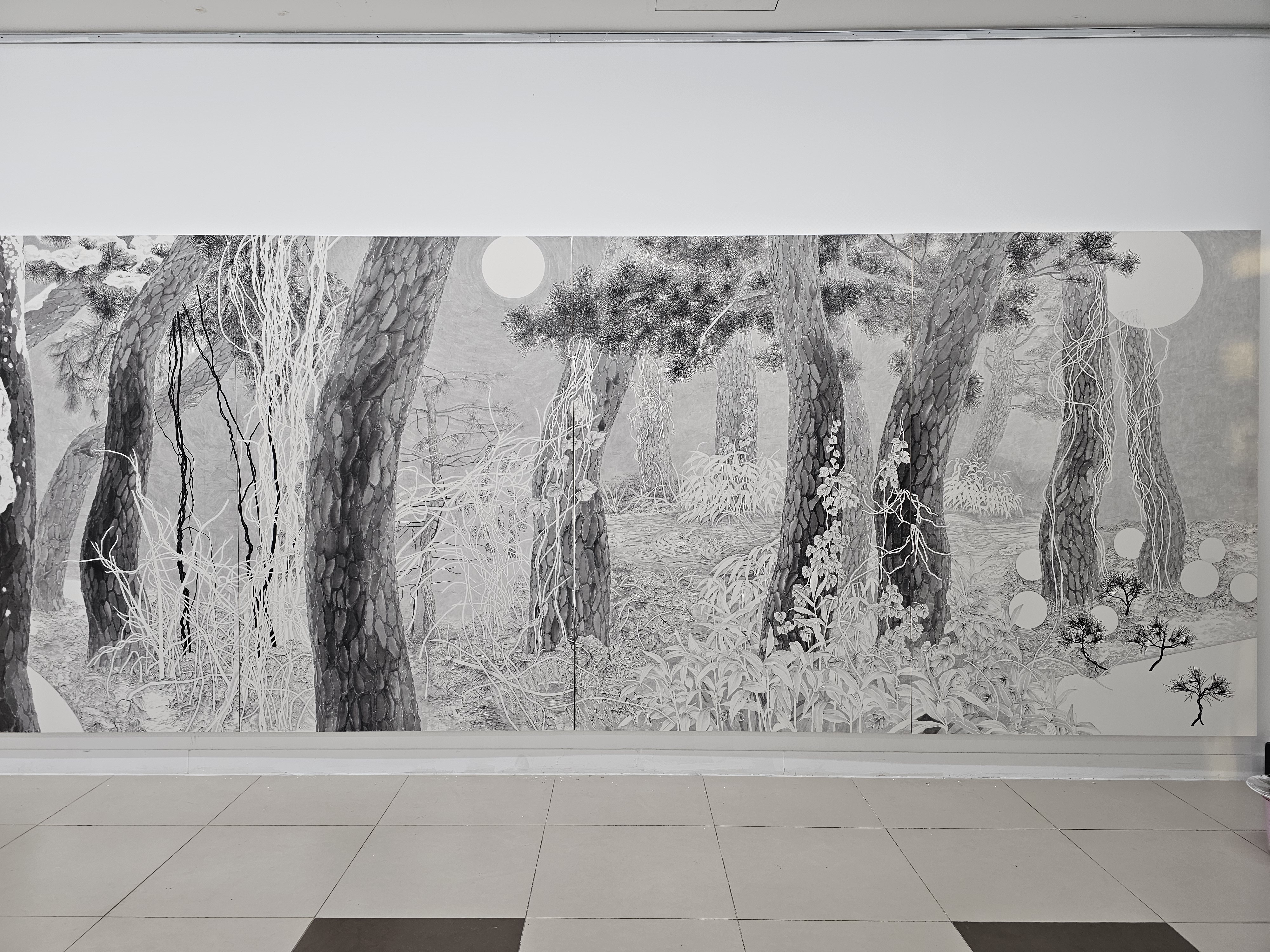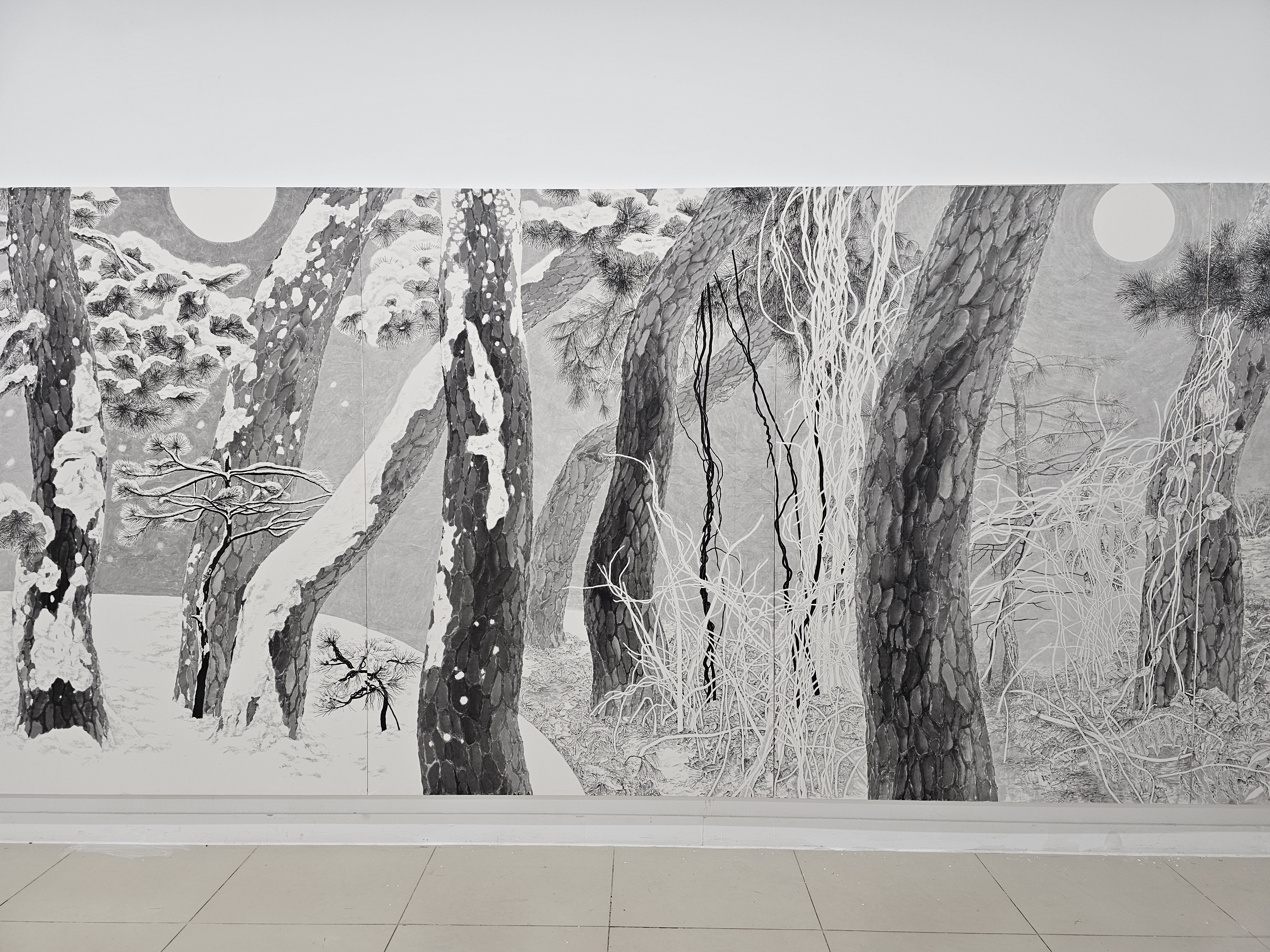 이러한 순환 속에서 구체적인 형태로 나타나는 존재가 바로 소나무와 넝쿨 줄기이다. 소나무는 내면의 신체처럼 중심을 이루고, 뻗어나가는 넝쿨 줄기는 감정의 흐름을 드러낸다. 두 경물은 유기적 구조를 형성하며, 나는 그 관계 속에서 생명과 감정의 순환적 질서와 상반된 성질의 공존을 체감한다. 그 흐름에 따라, 나는 작품 속 ‘나의 정원’을 형상화한다.