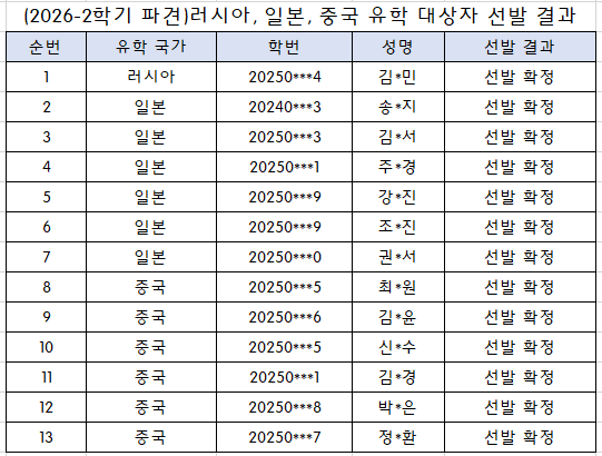 (2026-2학기 파견)러시아, 일본, 중국 유학 대상자 선발 결과를 아래와 같이 안내합니다.