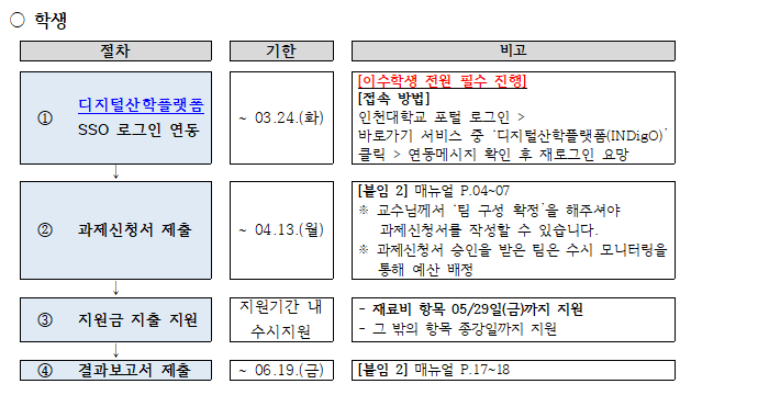 2026학년도 1학기에 개설된 캡스톤디자인 정규 교과목 수강 학생은 붙임파일에 있는 인디고 캡스톤디자인 활용 매뉴얼을 확인해주세요.