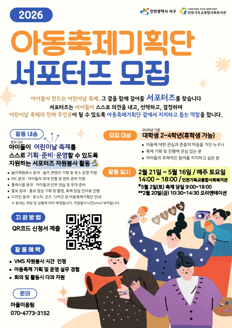 fnctId=bbs,fnctNo=747 [인천기독교종합사회복지관] 대학생 서포터즈(자원봉사자) 모집 글번호 419486 작성일 2026-02-13 수정일 2026-02-13 작성자 사회복지학과 조회수 276 첨부파일 첨부파일이(가) 없습니다. 다음글 [세화종합사회복지관] 이주배경 아동 프로그램 대학생 서포터즈 모집 이정명 2026-02-13 13:13:57.0 이전글 [시흥장애인종합복지관] 대학생 서포터즈 5기 모집! 이정명 2026-02-13 13:12:00.0 목록
