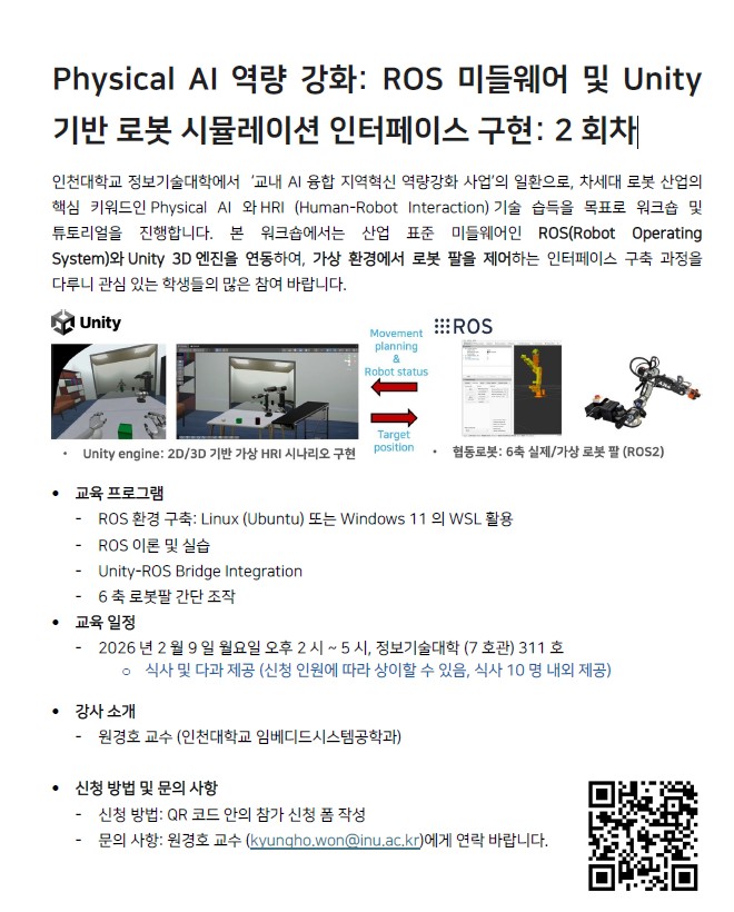 fnctId=bbs,fnctNo=370 Physical AI 역량 강화: ROS 미들웨어 및 Unity 기반 로봇 시뮬레이션 인터페이스 구현 (2회차) 글번호 418822 작성일 2026-02-03 수정일 2026-02-03 작성자 임베디드시스템공학과 (032-835-8760) 조회수 769 첨부파일 첨부파일이(가) 없습니다. 목록