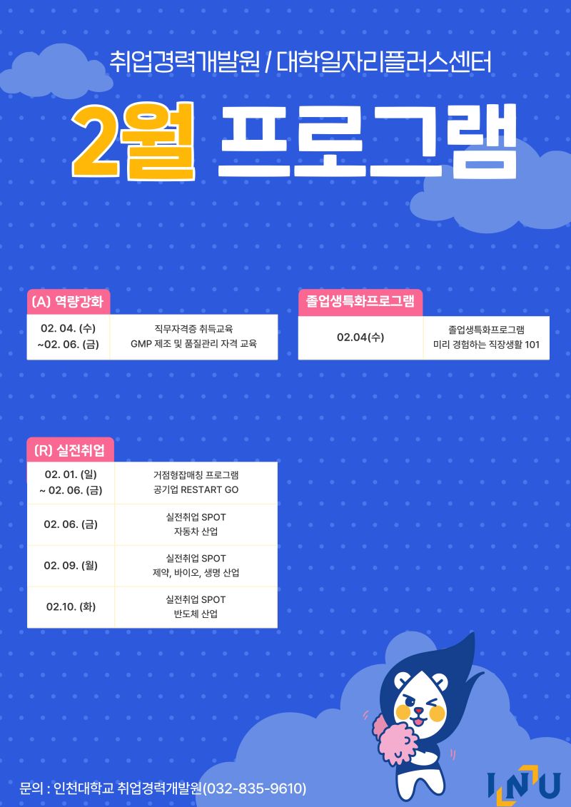 fnctId=bbs,fnctNo=600 [대학일자리플러스/취업경력개발원] 2월 프로그램 안내 글번호 419134 작성일 2026-02-09 수정일 2026-02-09 작성자 독어독문학과 (032-835-8130) 조회수 316 첨부파일 첨부파일이(가) 없습니다. 다음글 [취업경력개발팀/대학일자리플러스] 1월 카드뉴스 정연서 2026-02-09 09:36:31.0 이전글 [취업경력개발원/대학일자리플러스센터]12월 카드뉴스 정연서 2025-12-31 18:38:47.0 목록