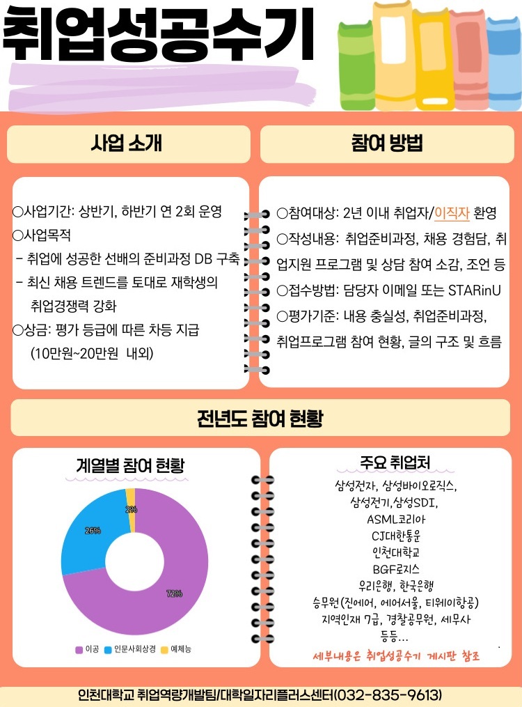| 2 | 취업성공수기 공모전 | 취업선배들의 경험담을 수기로 취합하여 노하우 및 취업팁 공유 | 5월 ~ 8월 10월 ~ 익년 2월 |