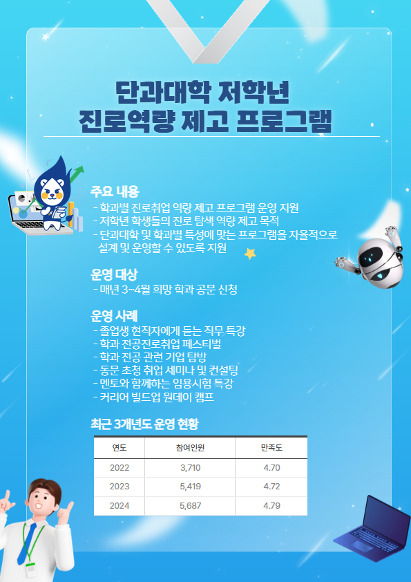 | 5 | 저학년 대상 진로설계 지원 | 진로설정 및 취업에 필요한 강의 및 정보 제공 | 3월~익년 1월 |