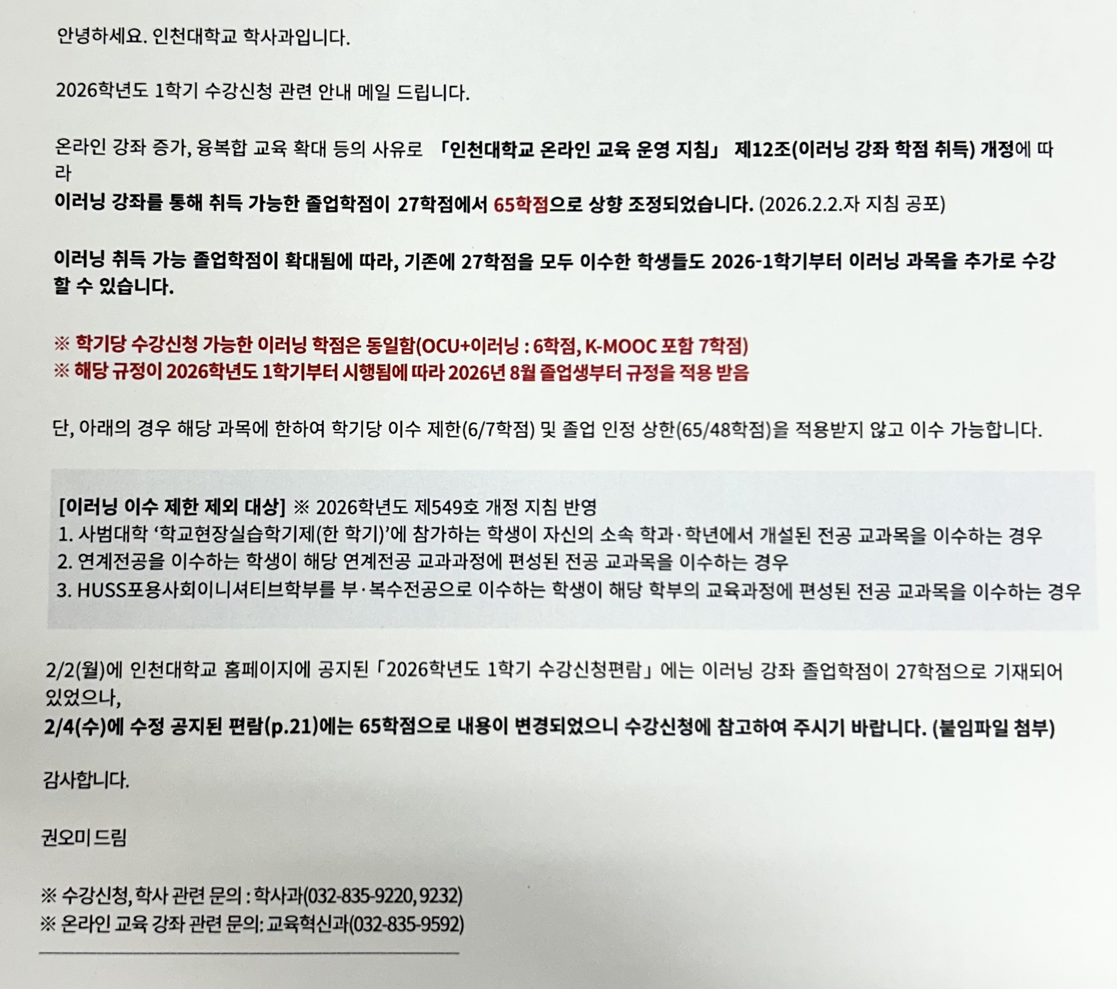 fnctId=bbs,fnctNo=286 2026-1학기 수강신청 편람 수정 안내(이러닝 강좌의 졸업학점 확대 관련 내용) 글번호 419063 작성일 2026-02-06 수정일 2026-02-06 작성자 국어국문학과 (032-835-8110) 조회수 609 첨부파일 첨부파일이(가) 없습니다. 다음글 2026학년도 교양 교육과정표 노희원 2026-02-10 10:53:07.0 이전글 2025-2학기 융합형 인재 장학금 신청 안내 강지은 2026-01-20 12:30:14.0 목록