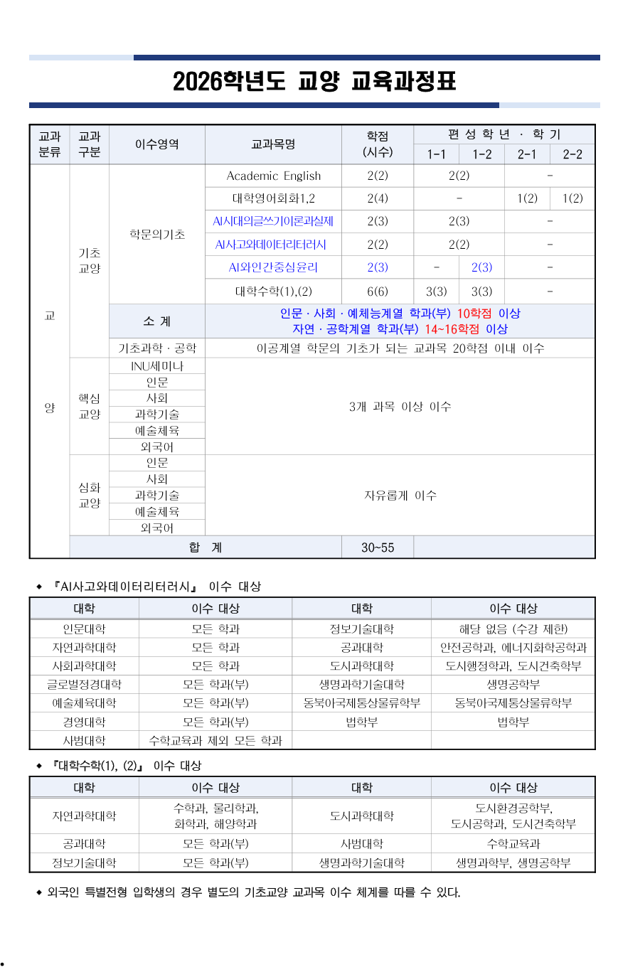 fnctId=bbs,fnctNo=286 2026학년도 교양 교육과정표 글번호 419228 작성일 2026-02-10 수정일 2026-02-10 작성자 국어국문학과 (032-835-8110) 조회수 341 첨부파일 첨부파일이(가) 없습니다. 다음글 2023학년도 이후 개편된 교양 교육과정 졸업요건 관련 주요사항 노희원 2026-02-10 10:54:58.0 이전글 2026-1학기 수강신청 편람 수정 안내(이러닝 강좌의 졸업학점 확대 관련 내용) 강지은 2026-02-06 11:18:22.0 목록