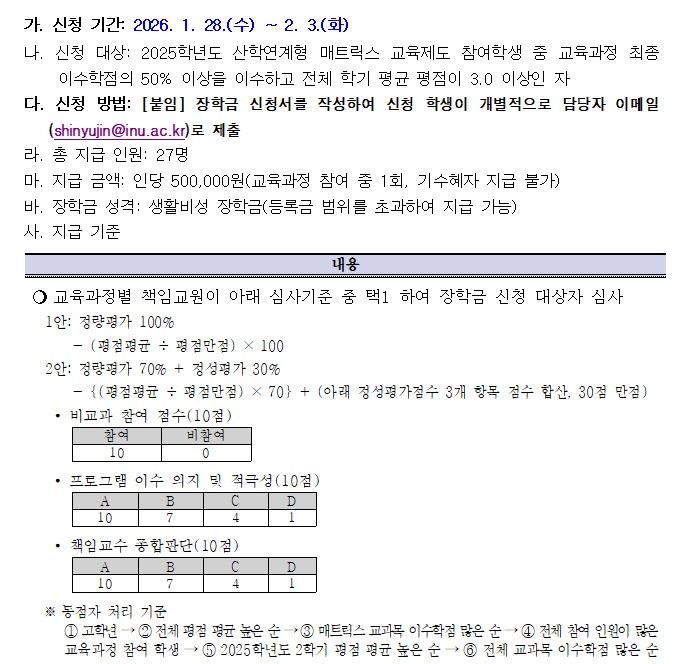 fnctId=bbs,fnctNo=730 2025학년도 매트릭스 교육제도 장학금 신청 안내 글번호 418500 작성일 2026-01-29 수정일 2026-01-29 작성자 해양학과 (032-835-8860) 조회수 570 첨부파일 매트릭스 교육제도 장학금 신청서.hwp 다음글 2026학년도 1학기 국가장학금 2차 신청 기간 안내 (2/3~3/17) 이혜진 2026-01-30 08:48:42.0 이전글 2026학년도 1학기 등록금 수납 계획 안내 (2/23~27) 이혜진 2026-01-27 11:42:29.0 목록