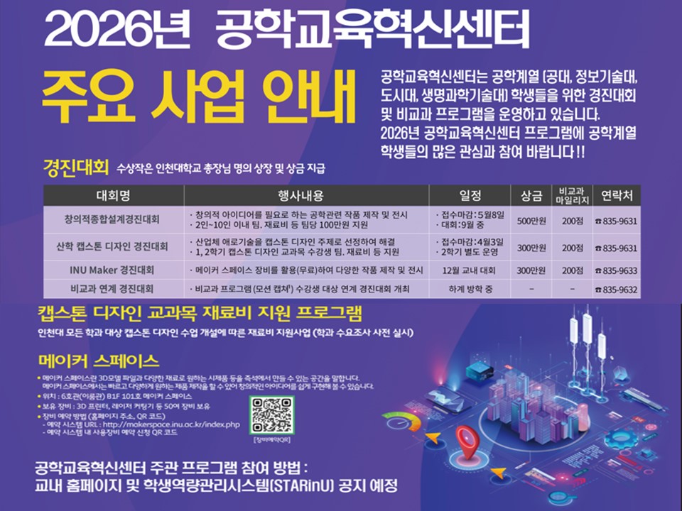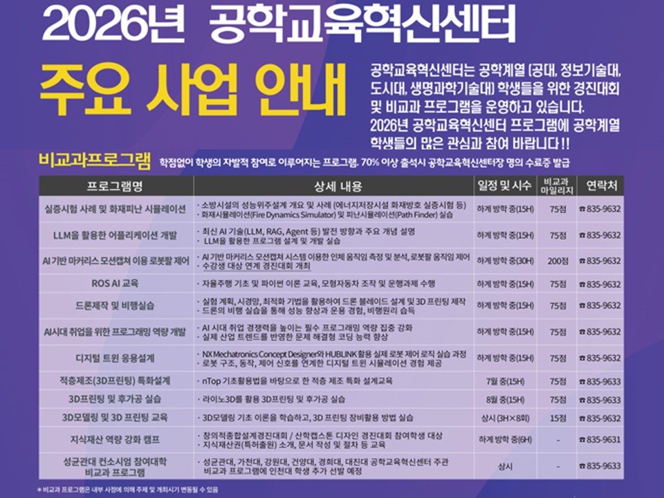 fnctId=bbs,fnctNo=349 공학교육혁신센터 2026년 주요 사업 안내 글번호 420184 작성일 2026-02-27 수정일 2026-02-27 작성자 바이오-로봇시스템공학과 조회수 719 첨부파일 첨부파일이(가) 없습니다. 다음글 2026학년도 신입생 기초학습능력 진단 및 증진 프로그램 운영 안내 표순남 2026-03-03 14:26:57.0 이전글 2026학년도 1학기 통학버스 및 셔틀버스 운행 안내 표순남 2026-02-27 16:05:32.0 목록