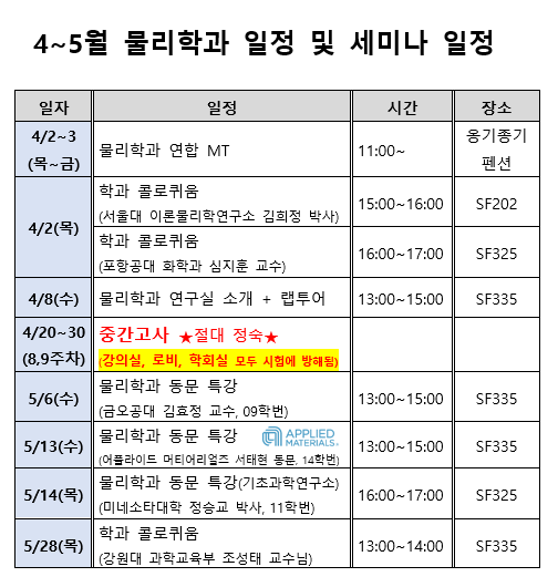 fnctId=bbs,fnctNo=716 4~5월 물리학과 일정 글번호 420688 작성일 2026-03-06 수정일 2026-04-08 작성자 물리학과 (032-835-8220) 조회수 734 첨부파일 첨부파일이(가) 없습니다. 목록