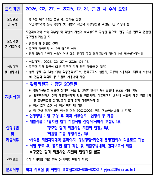 fnctId=bbs,fnctNo=2925 2026-1학기 자연과학대학 공모전 참가 지원 사업 신청 안내 글번호 421610 작성일 2026-03-24 수정일 2026-03-24 작성자 자연과학대학 (032-835-8202) 조회수 89 자연과학대학 소속 학부생들의 공모전 참여 확대를 위한 <공모전 참가 지원사업>에 참여할 학생들을 아래와 같이 모집합니다. 첨부파일 붙임1.2026학년도 공모전 참가 지원사업 신청서(서약서 포함).hwp 붙임2.2026년도 공모전 참가 지원사업 지원자 현황.xlsx 붙임3.간담회 회의록.hwp 붙임4.교통비 사용내역.hwp 붙임5.재료비 사용내역.hwp 붙임6.공모전 지원사업 최종 결과보고서(만족도조사지 포함).hwp 인천대학교 사업자등록증_20250527.pdf 붙임7.공모전 참가 지원사업 지원비 집행기준.hwp 목록