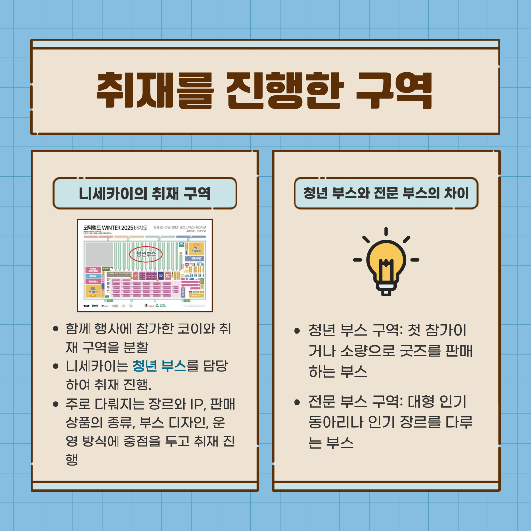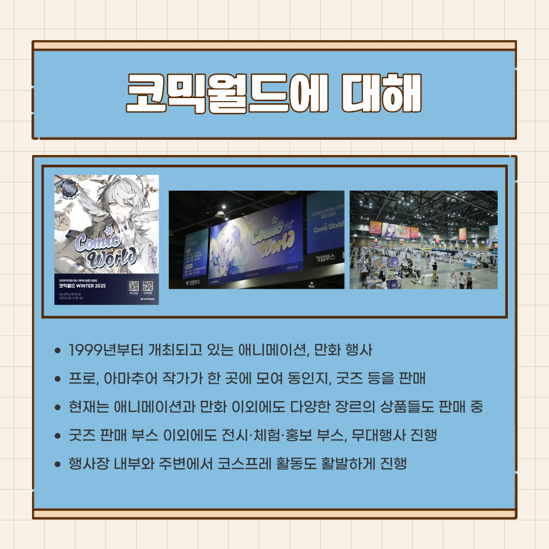 fnctId=bbs,fnctNo=657 [니세카이] 서울코믹월드 WINTER 2025 취재 보고서 글번호 417837 작성일 2026-01-13 수정일 2026-01-13 작성자 니세카이 조회수 837 첨부파일 첨부파일이(가) 없습니다. 다음글 이전글 2025-2학기 <소모임 유메카라 유니컬처 아이디어 챌린지 수상> 김하늘 2026-01-04 23:23:11.0 목록